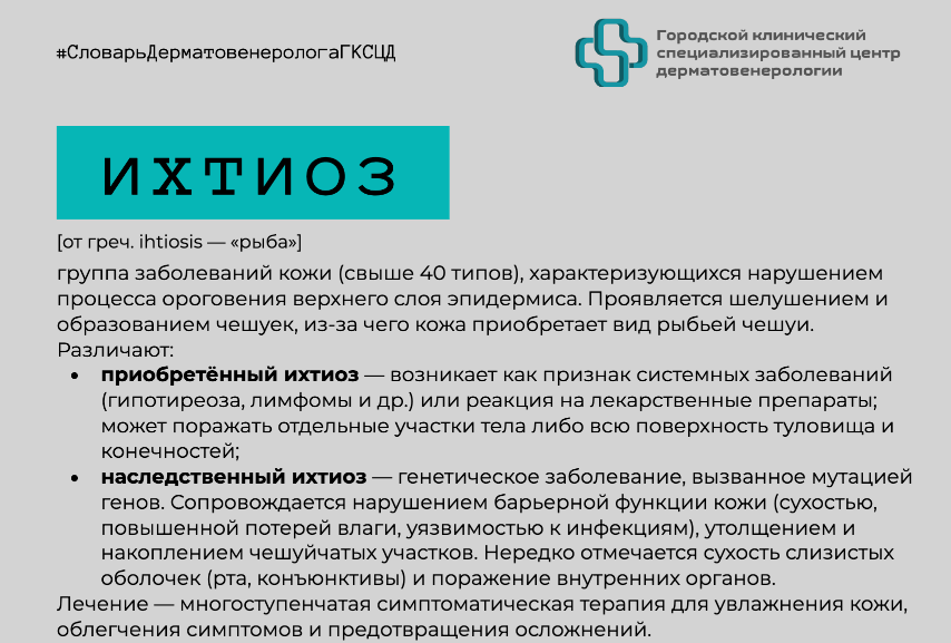 Сегодня разбираем ихтиоз — наследственное заболевание кожи, при котором она становится сухой и покрывается чешуйками (от греч. ichthys — «рыба»).
